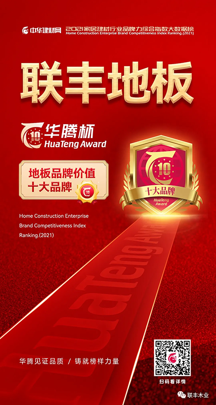 近日,由中华建材网发起主办的“华腾杯”2021家居建材行业中国地板十大品牌、地板十佳品牌网络评选活动重磅揭晓,该榜单聚焦家居建材企业的品牌影响力、创新驱动力和专业推广力,以严谨的态度、科学的体系、客观的模型综合考量家居建材企业品牌综合实力,联丰地板金榜题名,荣获“中国地板品牌价值十大品牌”“中国地板十佳品牌(实木类)”、“中国地板十佳品牌(强化类)”三项大奖,连续多年荣耀加身,见证品牌发展的历程、升级与活力。